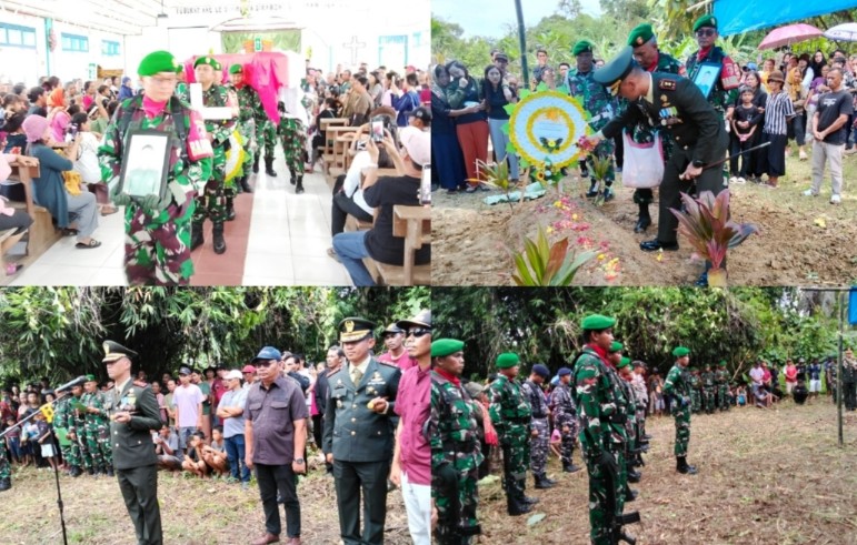 Proses pemakaman di lakukan upacara dengan penghormatan terakhir kepada Praka Raljusman Sababalat yang berlokasi di kampung halaman di Desa Mara, Kecamatan Sipora Selatan Kepulauan Mentawai, Sabtu (23/8/2025).