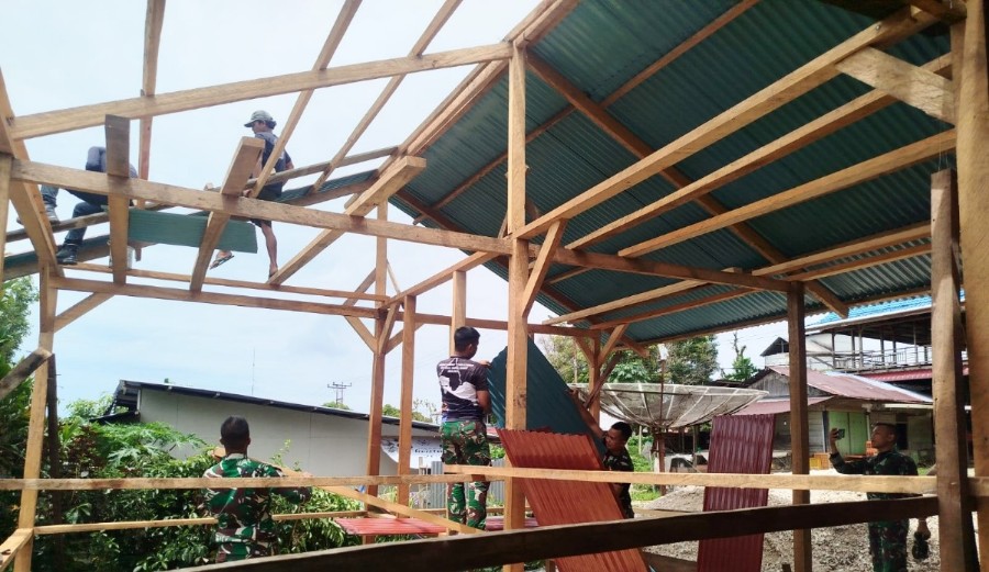 MENTAWAI|Matasumbar.com – Pengerjaan rehab rumah penerima manfaat Rudi Tafa’nao yang di kerjakan satgas TMMD ke-123 Kodim 0319/Mentawai sudah memasuki tahap pemasangan atap rumah.
