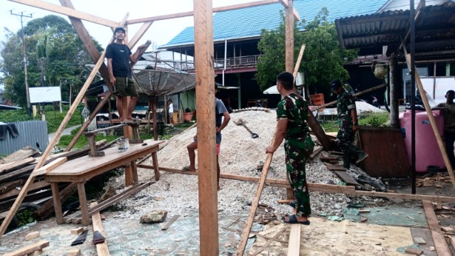 Salah satu rehab rumah penerima manfaat Rudi Tafo’nao yang di kerjakan satgas TMMD berlokasi di Desa Tuapeijat kondisi pengerjaannya sudah 25 persen.